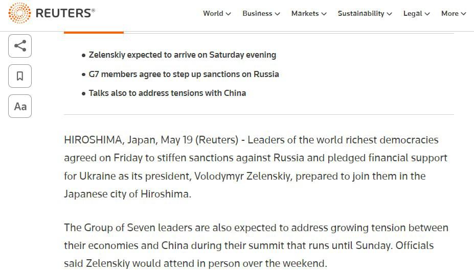 Но сейчас Reuters заявляет, что Зеленский все таки летит в Хиросиму. Ожидается, что он прибудет туда в субботу вечером.