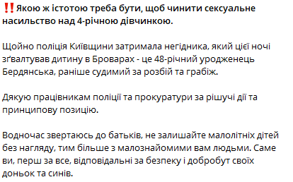 Глава полиции Киевской области призывает родителей не оставлять малолетних детей без присмотра, особенно в присутствии малознакомых людей, и напоминает, что родители несут основную ответственность за безопасность и благополучие своих детей.