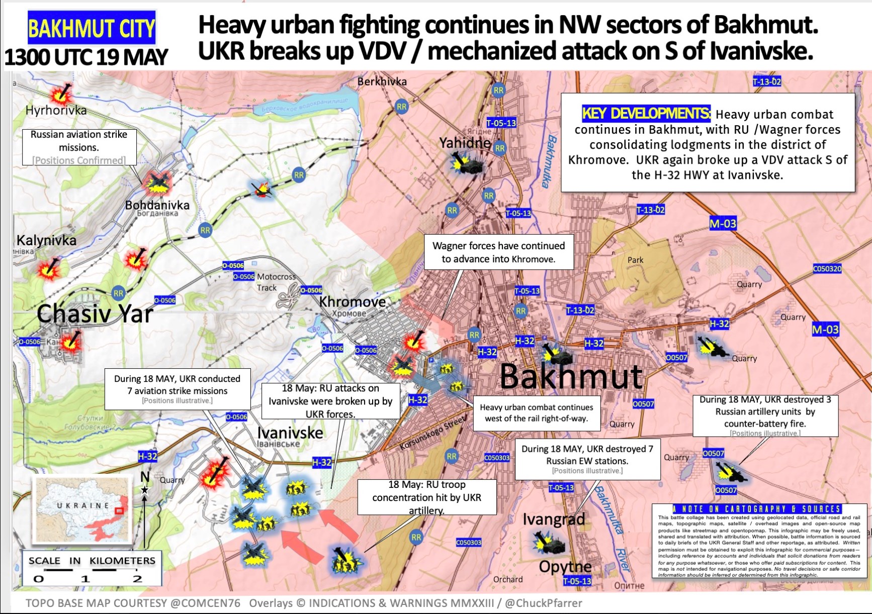 Однако ее вскоре опроверг куратор ЧВК "Вагнер" Евгений Пригожин. По его словам, город полностью ещё не захвачен, идут тяжелые бои на юго-западе Бахмута - в районе памятника самолёта, где, по утверждению Пригожина, украинские войска оборудовали мощный укрепрайон ("практически неприступную крепость").