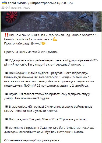 - В Днепровском районе из-за ракетного удара ранен 27-летний мужчина. Он находится в больнице в состоянии средней тяжести.