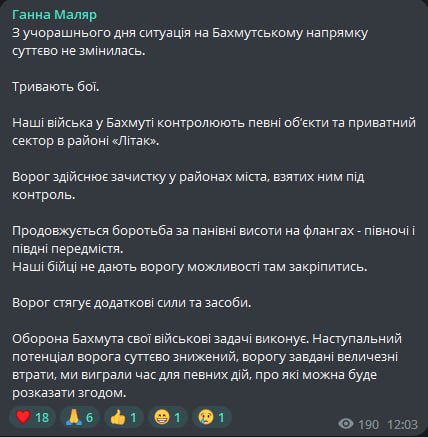 Он заявляет, что украинские подразделения сейчас по-прежнему удерживают юго-западную часть Бахмута, отбивая атаки россиян (в РФ, напомним, заявляют, что город уже полностью ими захвачен).