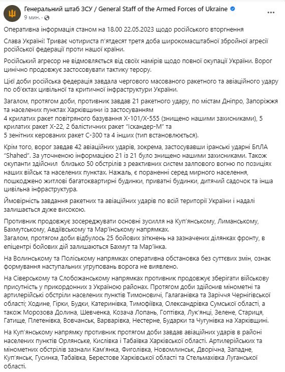 1. Российские оккупанты за эти сутки нанесли массированный ракетно-авиационный удар, информация будет опубликована после уточнения.