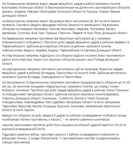 3. Противник продолжает сосредоточивать основные усилия на Купянском, Лиманском, Бахмутском, Авдеевском и Марьинском направлениях. За прошедшие сутки произошло 37 боевых столкновений на указанных участках фронта. В эпицентре боевых действий остаются Бахмут и Марьинка.