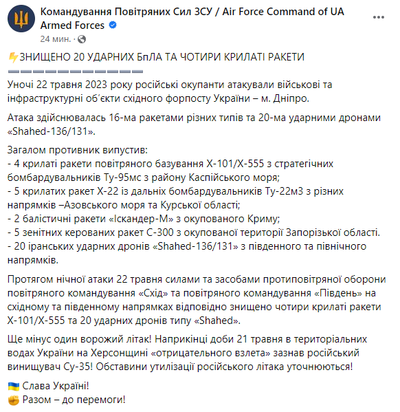 Сегодня ночью РФ ударила по Днепру. Воздушные силы ВСУ сообщают подробности удара.