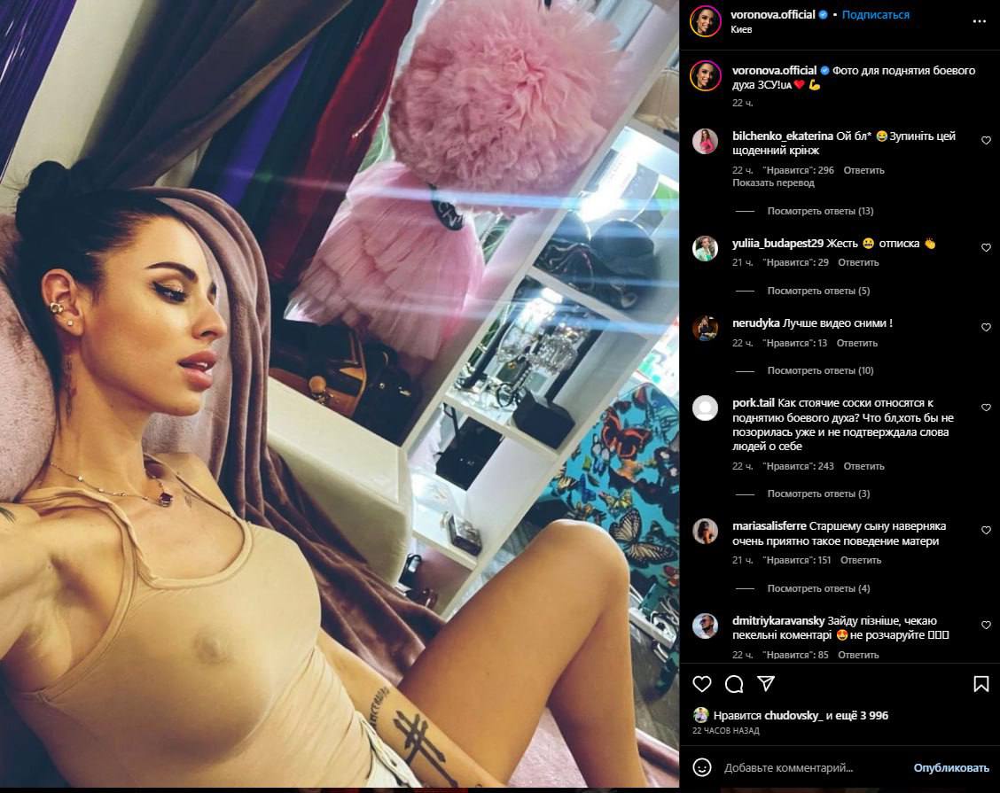 Украинская певица и блогер Инна Воронова, недавно попавшая в скандал с публикацией позиций ПВО, опубликовала в Instagram фото в прозрачной майке с подписью "Фото для поднятия боевого духа ВСУ".