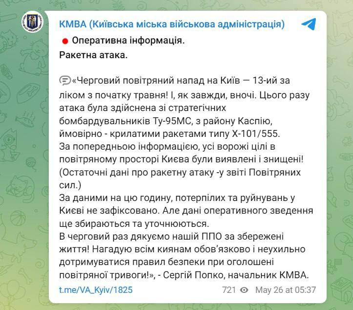 06.50 По информации главы Киевской городской военной администрации Сергея Попко, ночная атака на столицу осуществлялась крылатыми ракетами.