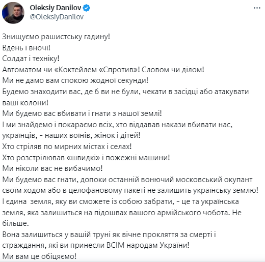 Секретарь СНБО Алексей Данилов заявил, что вооруженные силы Украины продолжат уничтожать врага, пока последний не покинет территорию страны. Украина никогда не простит россиянам военные преступления, все виновные получат свое наказание.