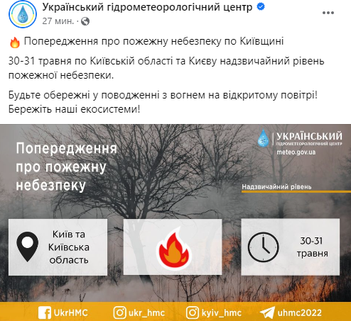 Также в эти дни по Киевской области и Киеву объявлен чрезвычайный уровень пожарной опасности. Синоптики советуют быть осторожными в обращении с огнем на открытом воздухе и беречь экосистему.