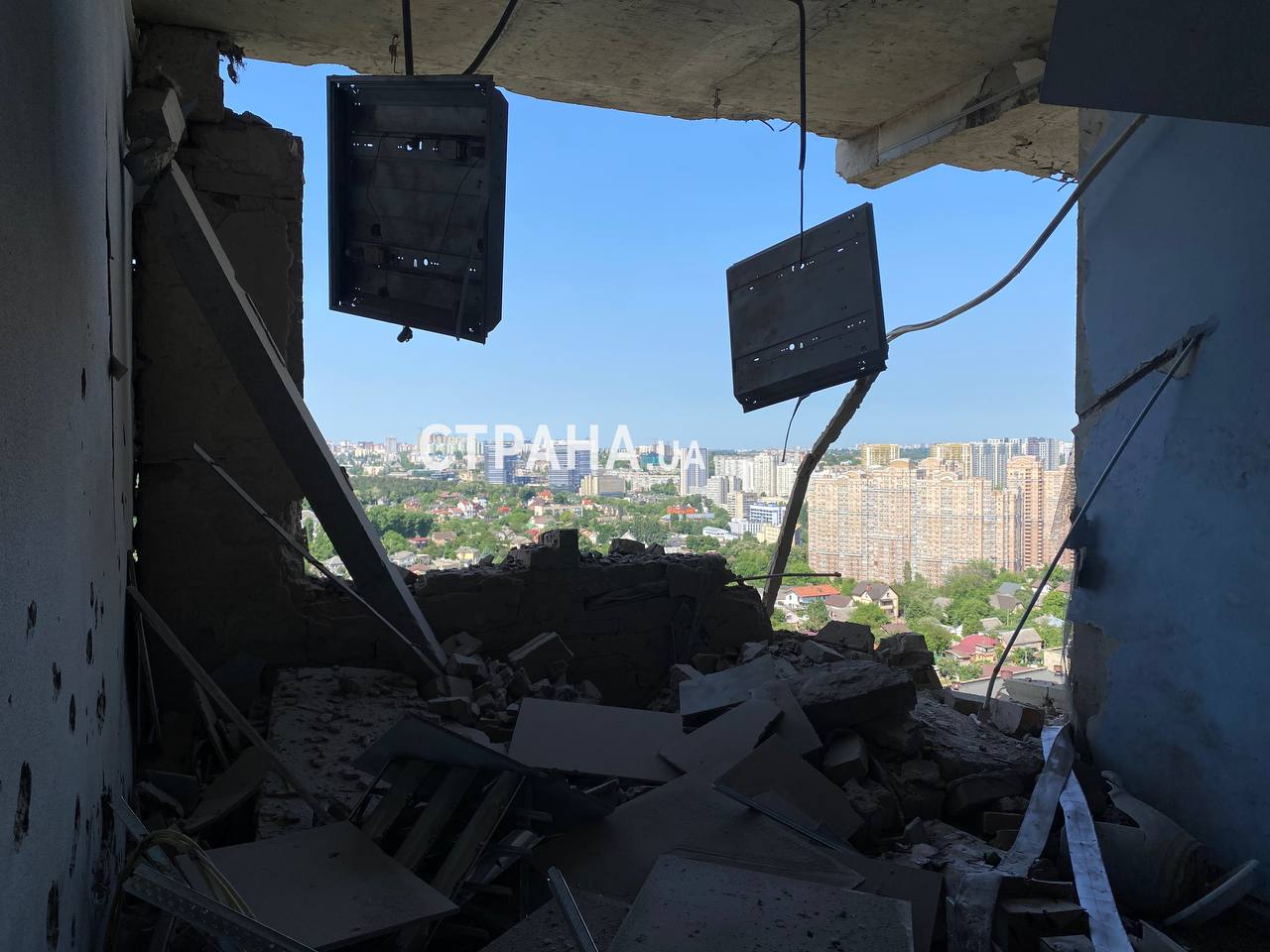 Появились кадры с разрушенных этажей многоэтажки в Голосеевском районе Киева, на которую упали обломки российского дрона.