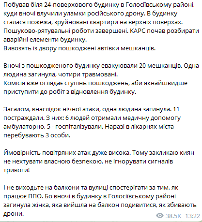 Всего в результате ночной атаке по столице погиб один человек, 11 пострадали, троим из них оказывают помощь в больнице.