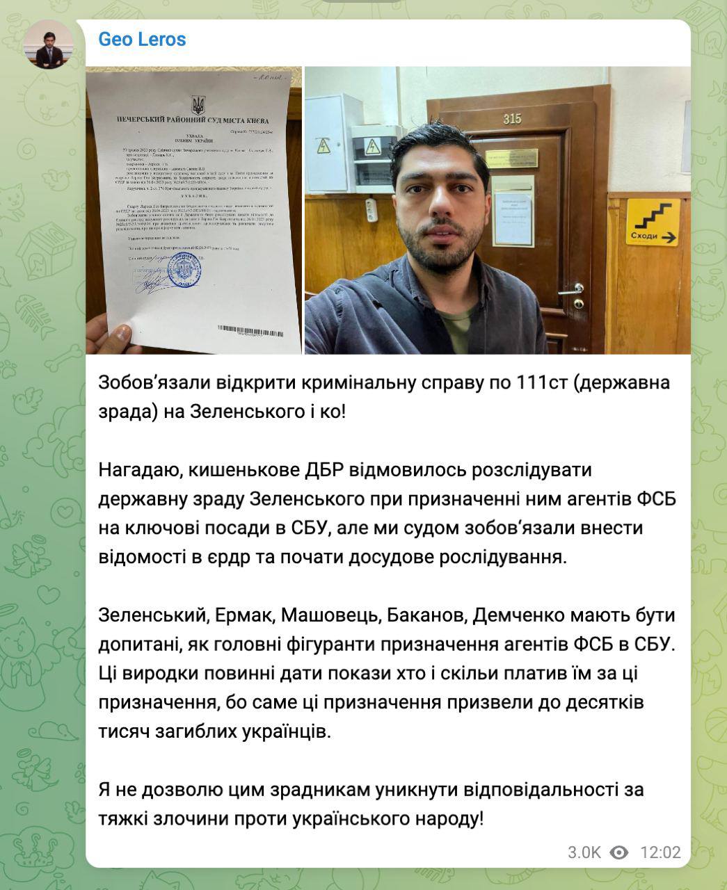 Лерос обвинил Зеленского в назначении агентов ФСБ в СБУ. Суд обязал ГБР открыть уголовное дело