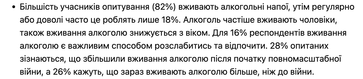 Согласно данным опроса, большинство опрошенных (82%) употребляют алкоголь. При этом 28% увеличили употребление спиртных напитков после 24 февраля 2022 года.