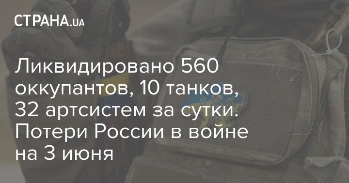 Потери России в войне в Украине на утро субботы, 3 июня, составили 560 оккупантов, общее число потерь российской армии с начала вторжения составляет 209470 военных. Кроме того, ВСУ уничтожили 10 танков, 12 ББМ и 32 артсистем за сутки.