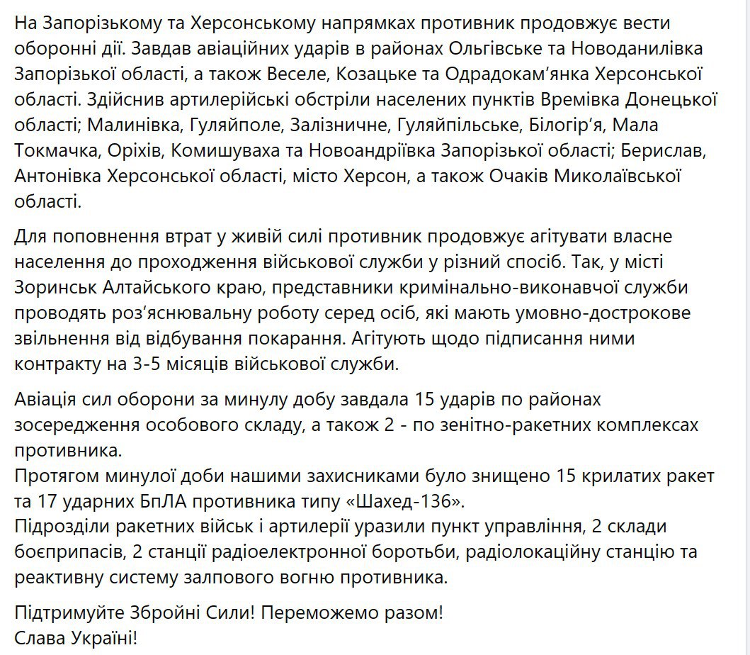 Авиация ВСУ нанесла 15 ударов по местам скопления противников и два удара по зенитно-ракетным комплексам противника. За прошедшие сутки наши защитники уничтожили 15 крылатых ракет и 17 БПЛА типа "Шахед-136".
