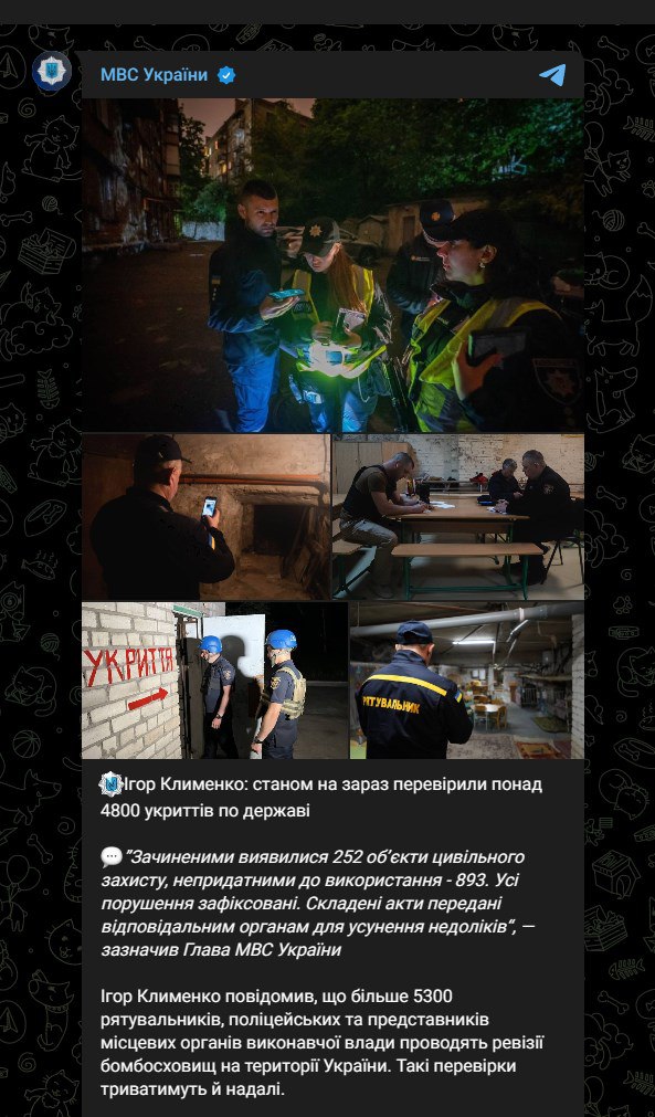 "Закрытыми оказались 252 объекта гражданской защиты, непригодными к использованию – 893", - цитирует Клименко телеграм-канал министерства.