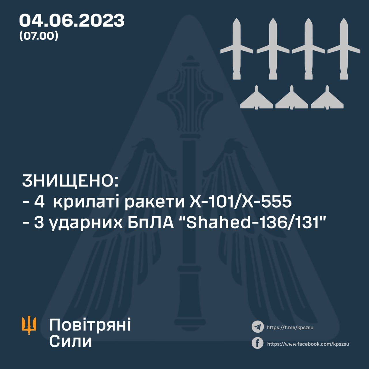 "С 01.00 по 04.00 4 июня 2023 года противник применил пять иранских ударных БпЛА "Shahed-136/131" из Брянской области, а также шесть крылатых ракет воздушного базирования Х-101/Х-555 – выпущены из шести стратегических бомбардировщиков 95мс из района Каспия. Силами и средствами противовоздушной обороны Воздушных Сил уничтожены четыре крылатых ракеты и три ударных дрона", - говорится в сообщении.