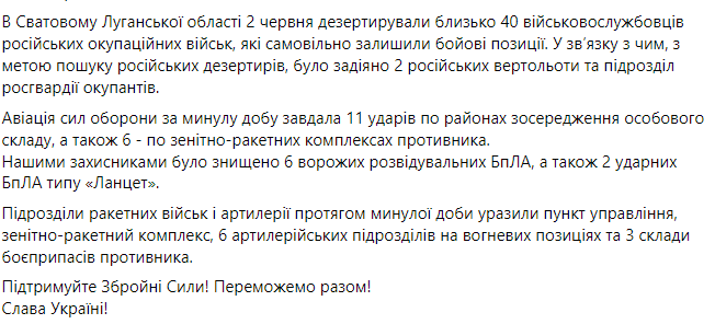 "В Сватово Луганской области 2 июня дезертировали около 40 военнослужащих российских оккупационных войск, которые самовольно оставили боевые позиции", - говорится в сообщении.