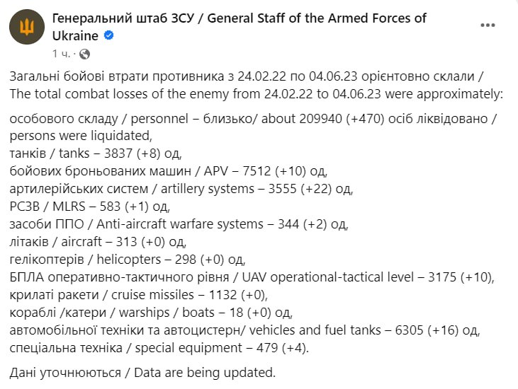 Потери России в войне в Украине на утро воскресенья, 4 июня, составили 470 оккупантов, общее число потерь российской армии с начала вторжения составляет 209940 военных. Кроме того, ВСУ уничтожили 8 танков, 10 ББМ и 22 артсистемы за сутки.