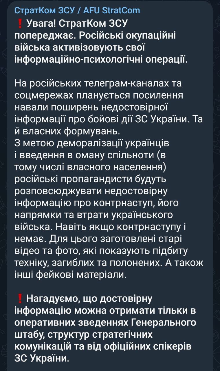 "Российские пропагандисты будут распространять недостоверную информацию о контрнаступлении, его направлениях и потерях украинской армии. Даже если контрнаступления и нет. Для этого заготовлены старые видео и фото, которые показывают подбитую технику погибших и пленных. А также другие фейковые материалы", - заявили в Страткоме.