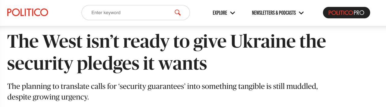 13.25 "Запад не готов давать Украине обещания безопасности, которые она хочет", - с таким заголовком вышла статья в Politico.