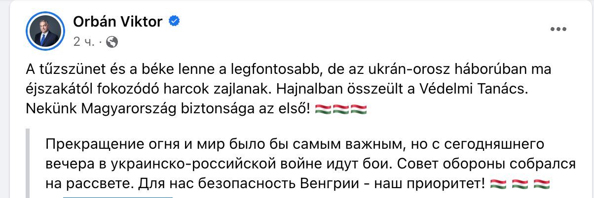 "Прекращение огня и мир было бы самым важным, но с сегодняшнего вечера в украинско-российской войне идут бои. Совет обороны собрался на рассвете. Для нас безопасность Венгрии - наш приоритет!", - написал Орбан в Twitter.