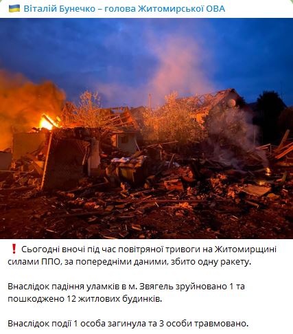 В результате падения обломков в городе Звягель разрушен один дом, повреждены еще 12 жилых домов.