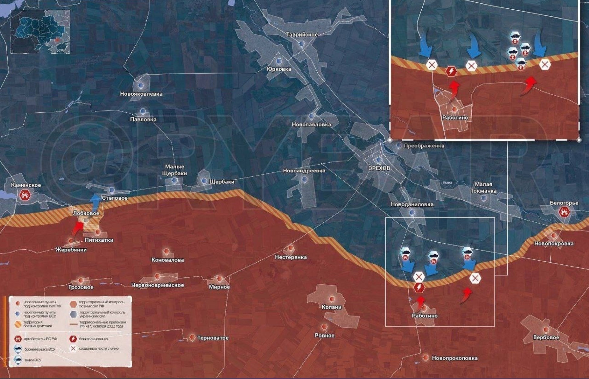 В частности, ВСУ, по данным россиян, атакуют на линии Работино - Вербовое, концентрируясь на узких участках российской обороны, и периодически продвигаются вперед. Российские войска отходят назад, а по украинским силам начинает бить артиллерия.