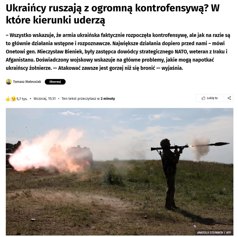 Onet, польский информационный портал, приводит мнение генерала Мечислава Бенека, бывшего замкомандующего стратегическими силами НАТО. Он считает, что на Запорожье наносятся "пробные удары, в которых задействованы не все силы. Они будут введены на участке, где контрнаступление будет иметь наибольшие шансы на успех".