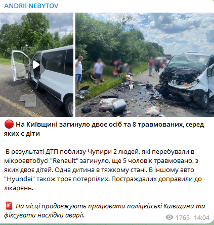 "В результате ДТП вблизи села Чупыры 2 человека, находившиеся в микроавтобусе "Renault" погибли, еще 5 человек травмированы, из которых двое детей. Один ребенок в тяжелом состоянии. В другом автомобиле "Hyundai" также трое пострадавших. Пострадавших доставили в больницы", - пишет Небытов.