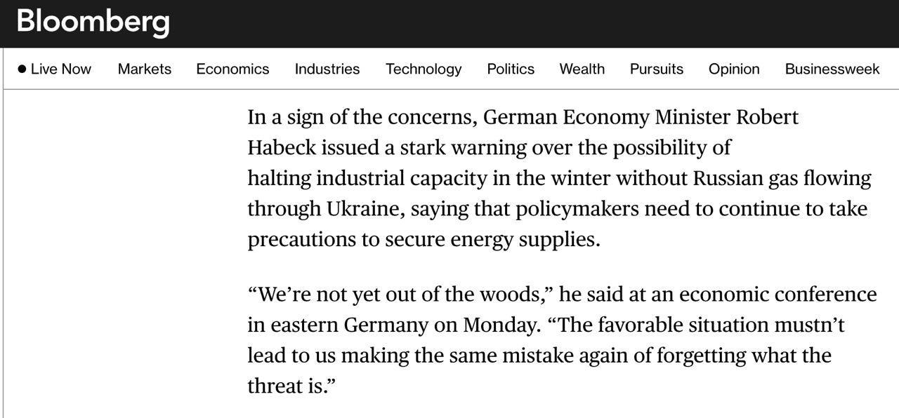Министр экономики ФРГ Роберт Хабек заявил, что немецкая промышленность рискует остановиться зимой в случае прекращения транзита российского газа через Украину.