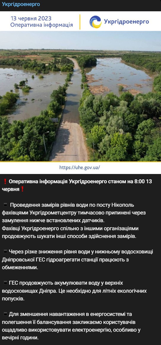 Ранее заявлялось, что уровень воды падает по 5 сантиметров в час. Последнее сообщение о глубине водохранилища в районе Никополя - 9,04 метра по состоянию на 12 июня.
