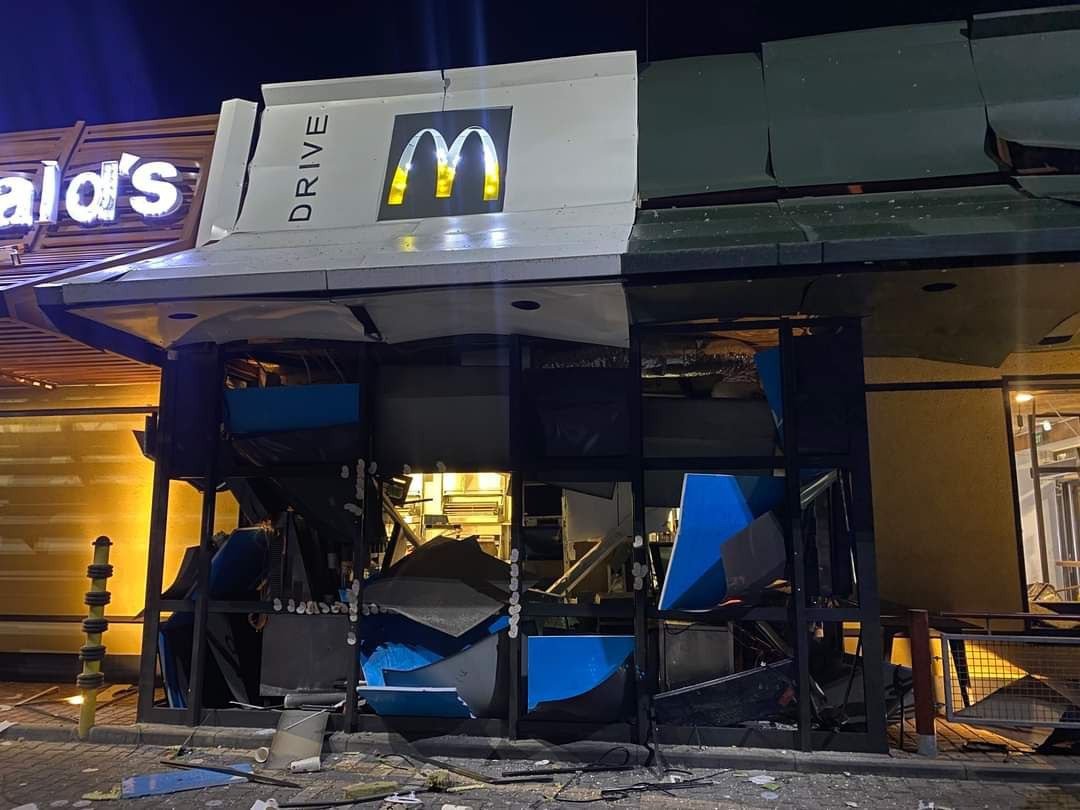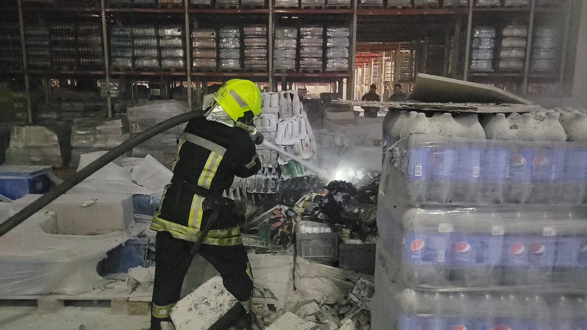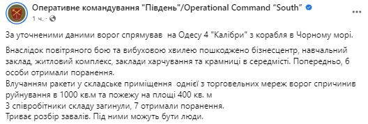 После попадания ракеты в складское помещение одной из торговых сетей произошло разрушение на площади 1000 кв.м и пожар на площади 400 кв. м. Три сотрудника склада погибли, семь получили ранения.