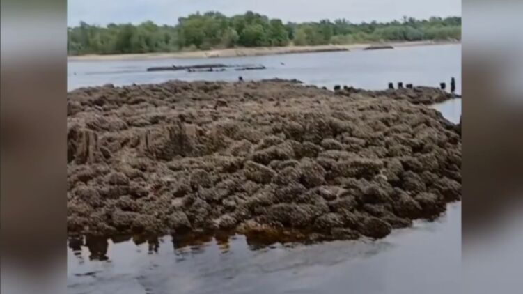 После обмеления Днепра в Запорожье открылись остатки старого моста на Хортицу. Видео