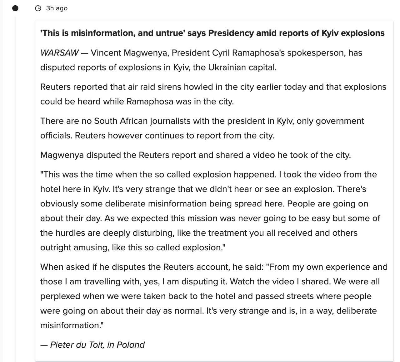 "Мы все были озадачены, когда нас отвезли обратно в отель и мы проезжали улицы, где люди вели обычный день. Это очень странно и в каком-то смысле является преднамеренной дезинформацией", — считает представитель президента ЮАР.
