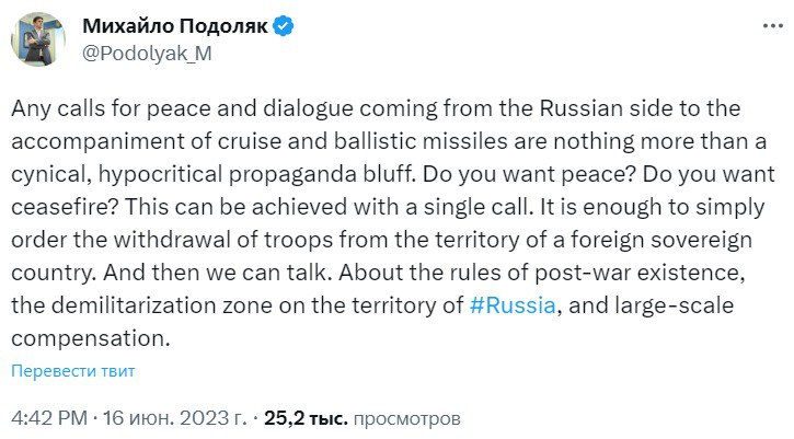 "Любые призывы к миру и диалогу, исходящие с российской стороны под аккомпанемент крылатых и баллистических ракет, не более чем циничный, лицемерный пропагандистский блеф. Вы хотите мира? Вы хотите прекращения огня? Этого можно добиться одним звонком. Достаточно просто отдать приказ о выводе войск с территории иностранного суверенного государства. И тогда мы сможем поговорить. О правилах послевоенного существования, зоне демилитаризации на территории России и крупных компенсациях", – написал Подоляк в соцсети.