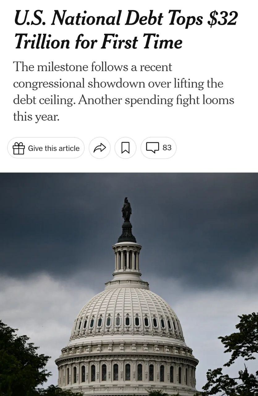 Государственный долг Соединенных Штатов впервые превысил 32 триллиона долларов.