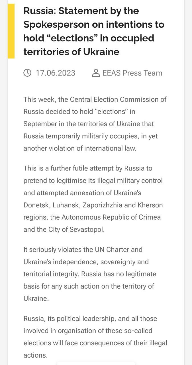 "Россия, ее политическое руководство и все, кто причастен к организации этих так называемых выборов, столкнутся с последствиями своих незаконных действий", - добавил он.