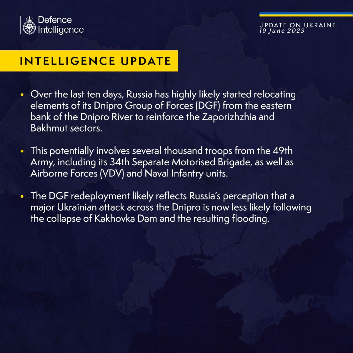 По мнению британцев, это указывает на то, что Россия считает маловероятной крупную украинскую атаку через Днепр после подрыва Каховской плотины.