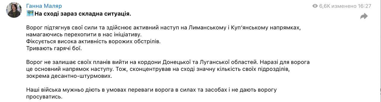 «Враг подтянул свои силы и активно наступает на Лиманском и Купянском направлениях, пытаясь перехватить у нас инициативу. Фиксируется высокая активность вражеских обстрелов. Продолжаются горячие бои. Наши войска не дают врагу продвигаться», - заявила Маляр.
