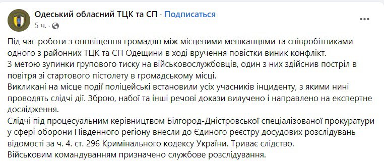 "Во время работы по оповещению граждан между местными жителями и сотрудниками одного из районных ТЦК и СП Одесской области в ходе вручения повестки возник конфликт. В целях остановки группового давления на военнослужащих один из них произвел выстрел в воздух из стартового пистолета в общественном месте", – говорится в посте ТЦК.