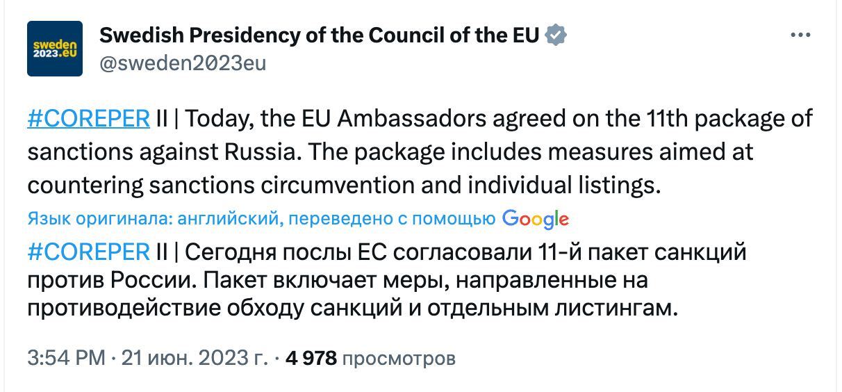 "Сегодня послы ЕС согласовали 11-й пакет санкций против России. Пакет включает меры, направленные на противодействие обходу санкций и уточнению отдельных позиций", - сказано в посте.