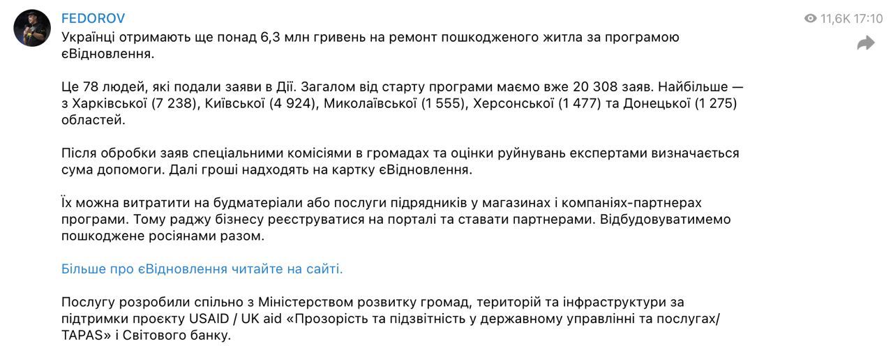 "Это 78 человек, подавших заявления в "Дие". Всего от старта программы уже 20 308 заявлений. Больше всего - из Харьковской (7238), Киевской (4924), Николаевской (1555), Херсонской (1477) и Донецкой (1275) областей", - сообщает министр.