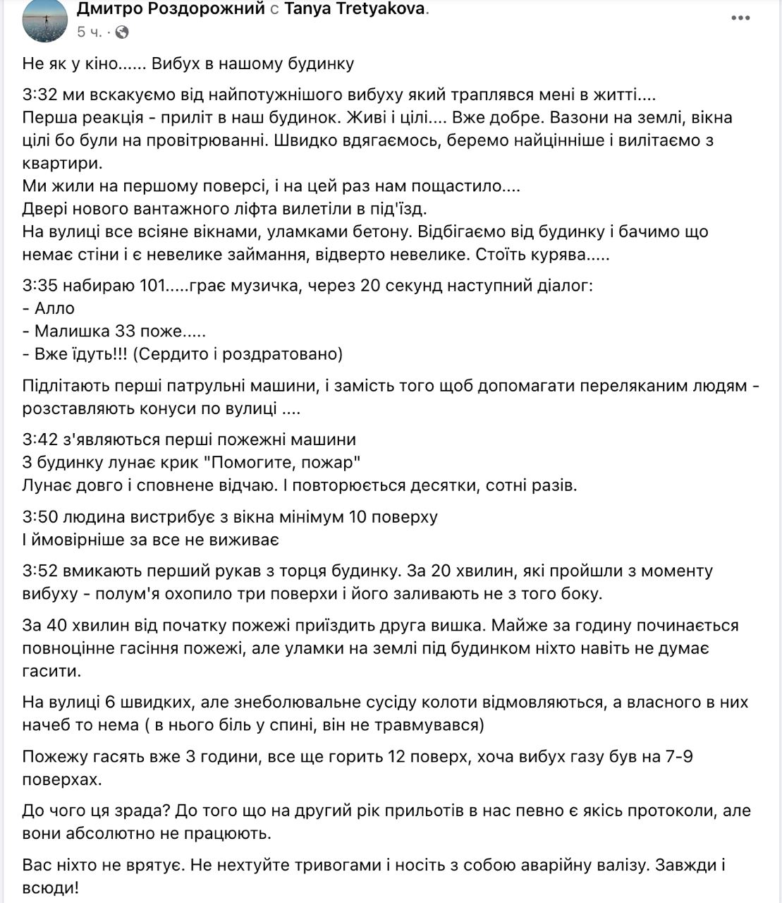 Через 40 минут после начала пожара приезжает вторая вышка. Почти через час начинается полноценное тушение пожара, но обломки на земле под домом никто даже не думает тушить. Пожар тушат уже 3 часа, все еще горит 12 этаж, хотя взрыв газа был на 7-9 этажах", - пишет Раздорожный.