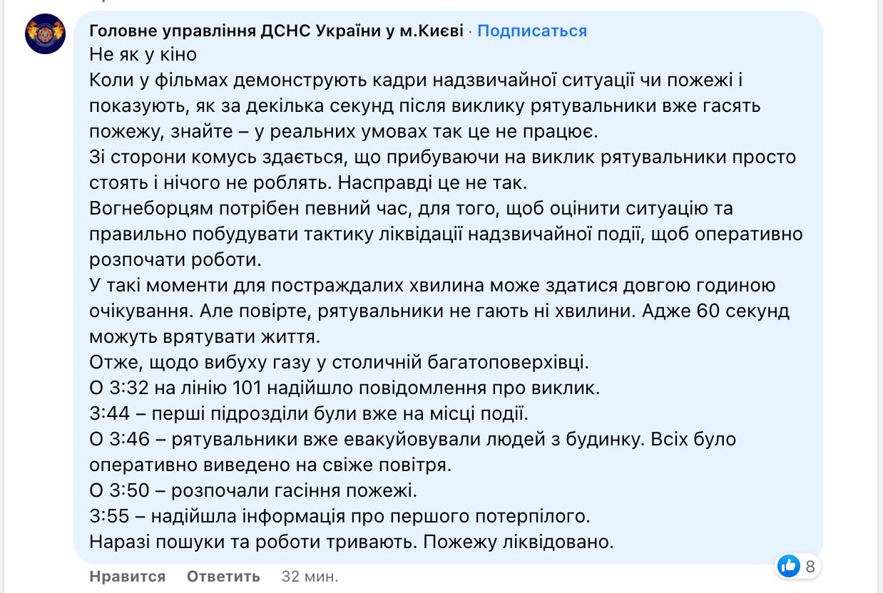 Житель многоэтажного дома в Днепровском районе Киева, где сегодня ночью взорвался газ, раскритиковал спасателей за медлительную работу по ликвидации пожара.