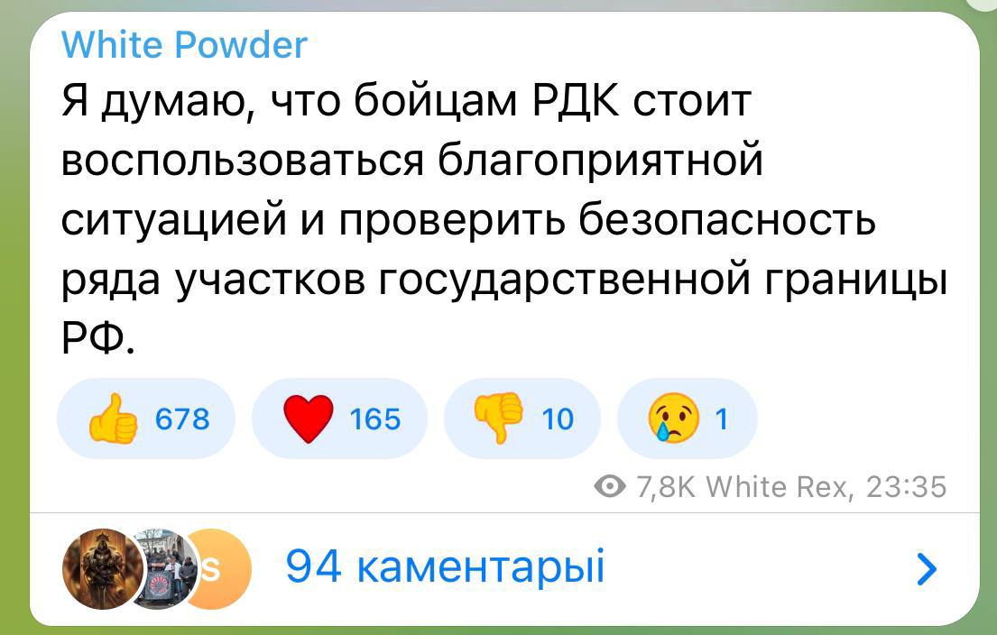 00.49 Представители воюющего на стороне Украины "Русского добровольческого корпуса" также с воодушевлением восприняли действия Пригожина. Готовятся к новым рейдам на территорию РФ.