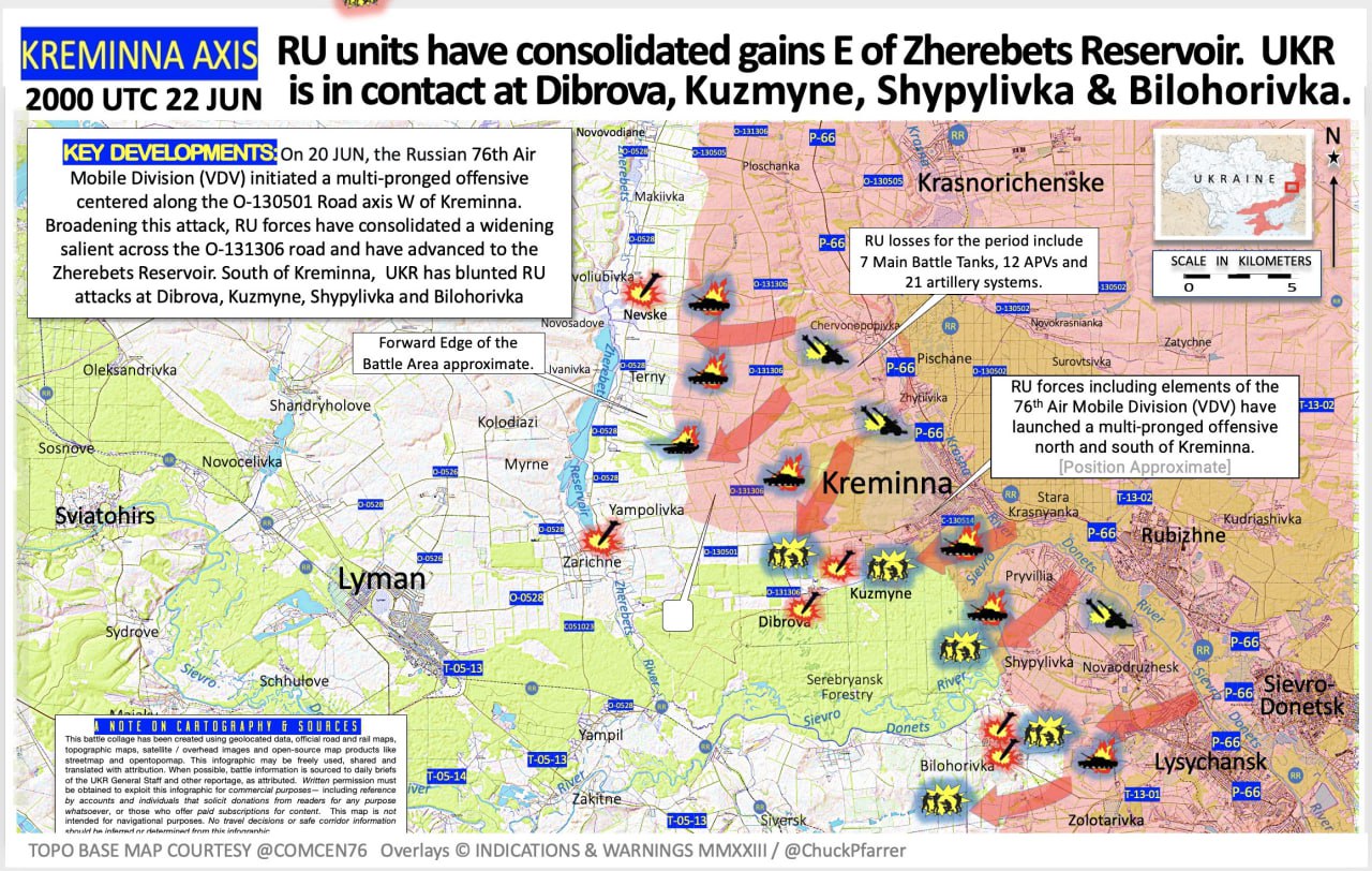 "Силы РФ начали многостороннее наступление, сосредоточенное на оси дороги O-130501 западнее Кременной. Расширяя эту атаку, российские войска закрепили расширяющийся выступ через автодорогу O-131306 и продвинулись к Жеребецкому водохранилищу", - сообщил аналитик.