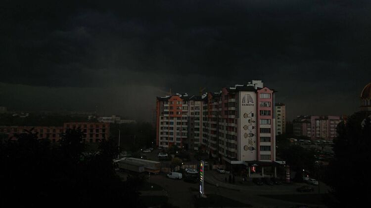 На снимках можно заметить темное грозовое небо над городом, из-за чего Ивано-Франковск практически погрузился во тьму.