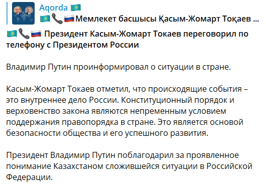 Сообщается, что Владимир Путин проинформировал о ситуации в стране, на что Токаев ответил, что "происходящие события – это внутреннее дело России".
