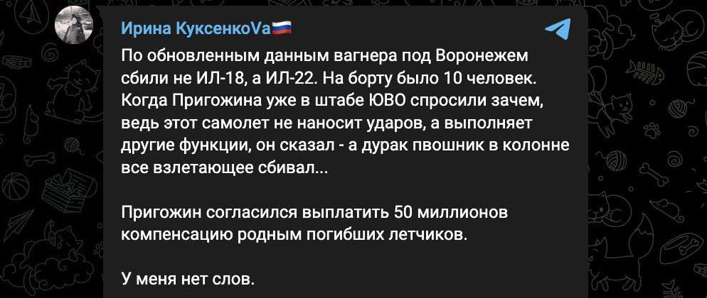 "Когда Пригожина уже в штабе ЮВО спросили, зачем [было сбивать самолет], ведь этот самолет не наносит ударов, а выполняет другие функции, он сказал: а дурак-пвошник в колонне все взлетающее сбивал", - написала Куксенкова.