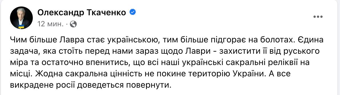 "Единственная задача, которая стоит перед нами сейчас в отношении Лавры – защитить ее от русского мира и окончательно удостовериться, что все наши украинские сакральные реликвии на месте. Ни одна сакральная ценность не покинет территорию Украины. А все украденное Россией придется вернуть", - написал глава Минкульта.